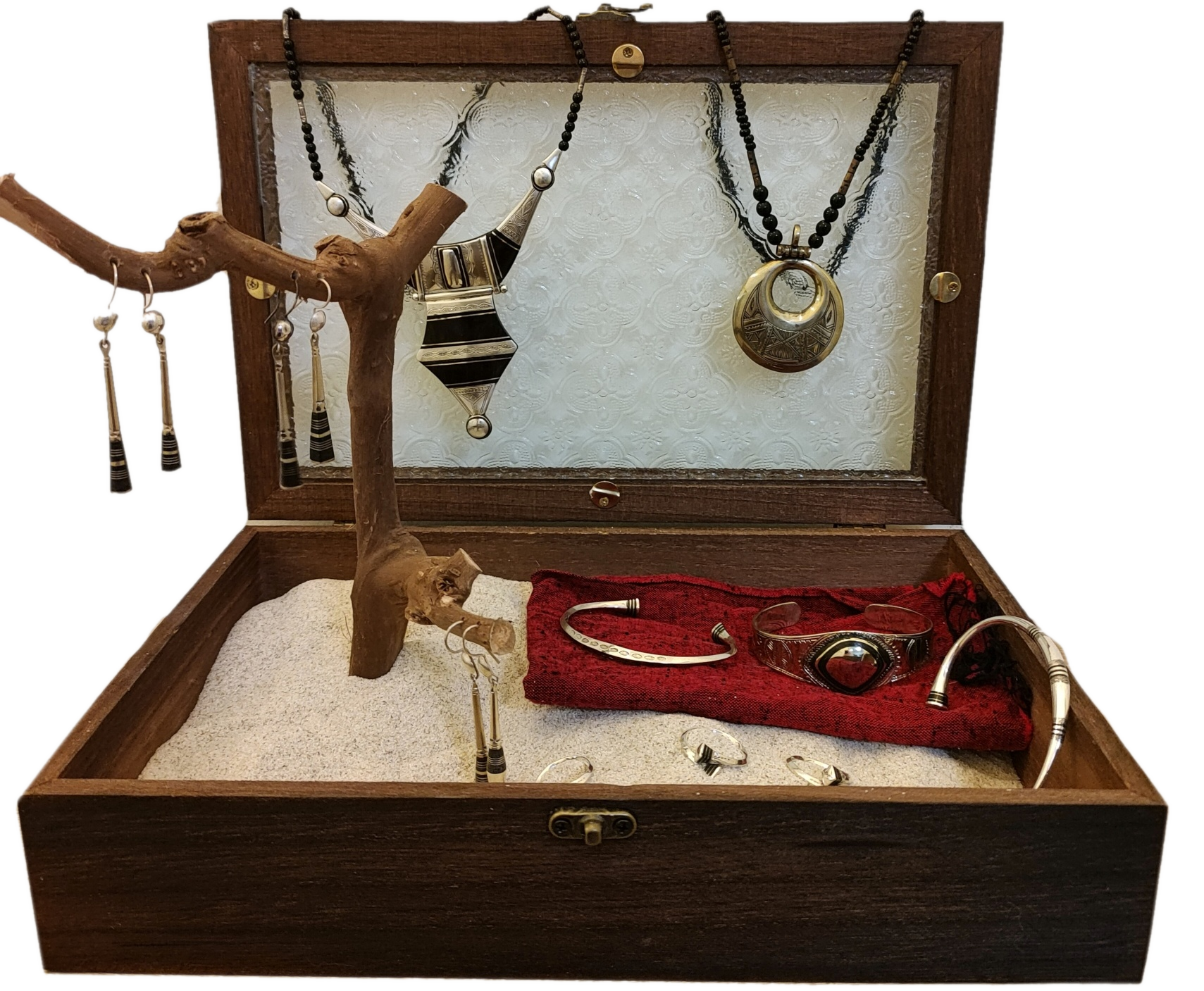 展示盒內含沙子與一棵小樹, 用於呈現產品背景與文化氛圍。