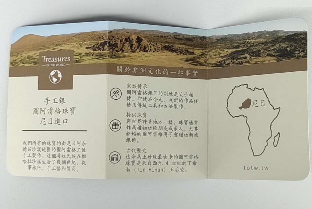 同時亦可提供圖阿雷格(Tuareg)文化與飾品背景的介紹小冊,零售商可選擇是否於每件飾品隨附交付給顧客。
